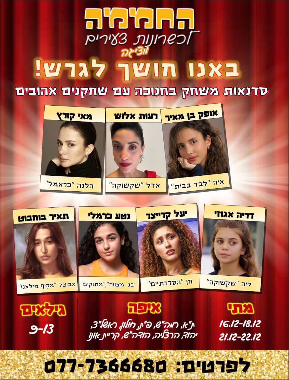 16.12-18.12 ימים ג- ה 09:00-13:00 (חופשת חנוכה ) . סטודיו למחול של יעל. סדנאות משחק עם שחקנים אורחים .