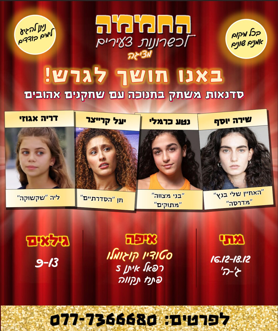 16.12-18.12 ימים ג-ה . 09:00-13:00 סטודיו קוגומלו . קניון ספיר אם המושבות . סדנאות משחק עם שחקנים אורחים