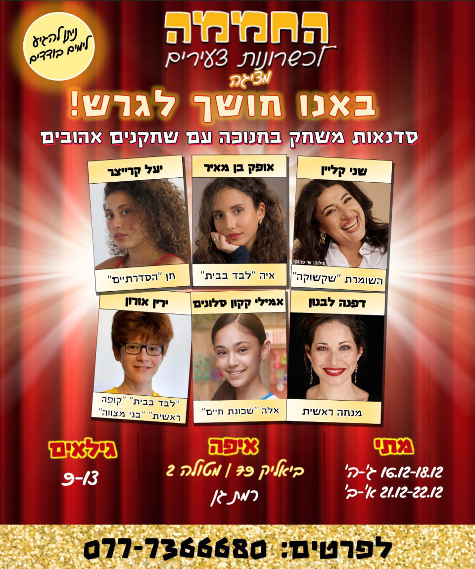 16.12-22.12 ימים ג-ב ( לא כולל שיש שבת ) סדנאות משחק עם שחקנים אורחים .ניתן לבטל עד 5 ימים לפני תחילת פעילות . החזר מלא
