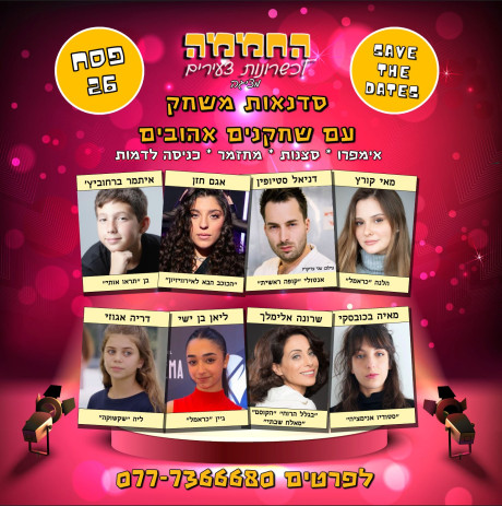 סדנאות משחק עם שחקנים אורחים| 24.3-31.3 | ימים ד-ה + א-ב | לא כולל שישי שבת | שעות 09:30-13:30 | ניתן לבטל ולקבל החזר מלא עד 5 ימים לפני תחילת הפעילות | מיקום- סטודיו סטייל . רחוב זבוטינסקי 65 .