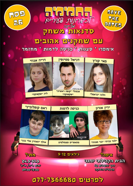 3 ימים לבחירה בין התאריכים- 24.3-31.3 - פסח של סדנאות משחק עם שחקנים אורחים בהרצליה הירוקה.