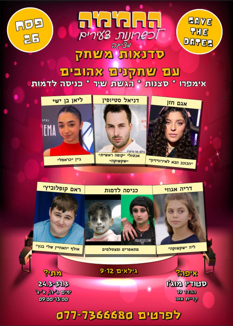 24.3-31.3 | 6 ימים של סדנאות משחק עם שחקנים אורחים | 09:00-13:00 | סטודיו מוג'ו שברחוב ההדר