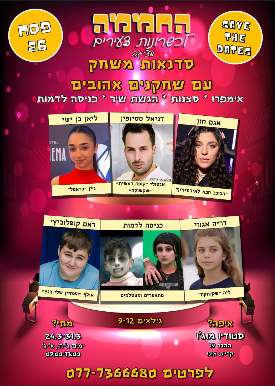 5 ימים לבחירה בין התאריכים 24.3-31.3 . סדנאות משחק עם שחקנים אורחים . סטודיו מוג'ו . רחוב ההדר.